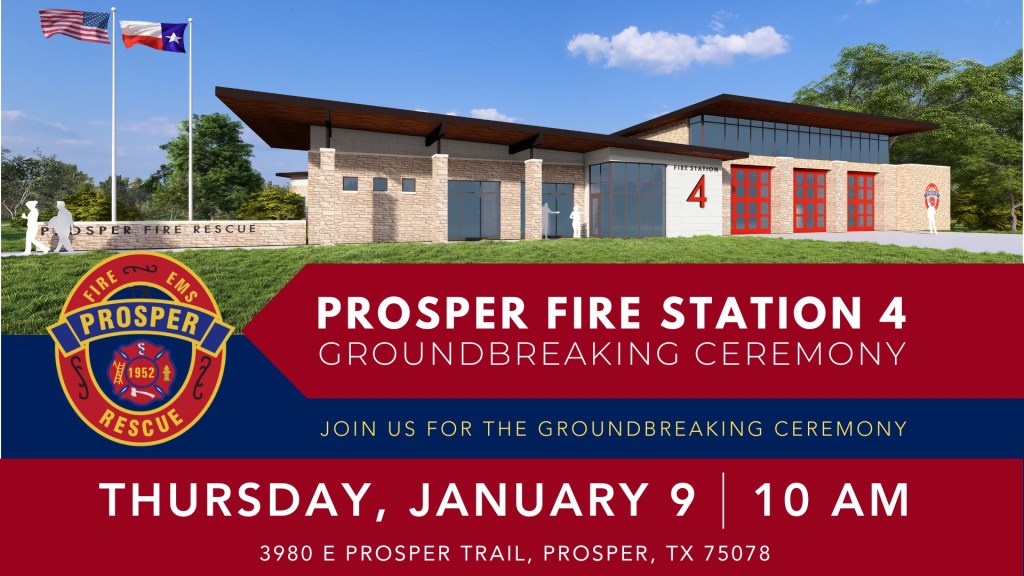 The Town of Prosper would like to invite the public out for the groundbreaking ceremony of Prosper Fire Station 4 on Thursday, January 9th, at 10:00a.m. The new station will be located at 3980 E. Prosper Trail in Prosper, Texas, which is just west of Cockrell Elementary School. This station will be the fourth for the Town of Prosper.
